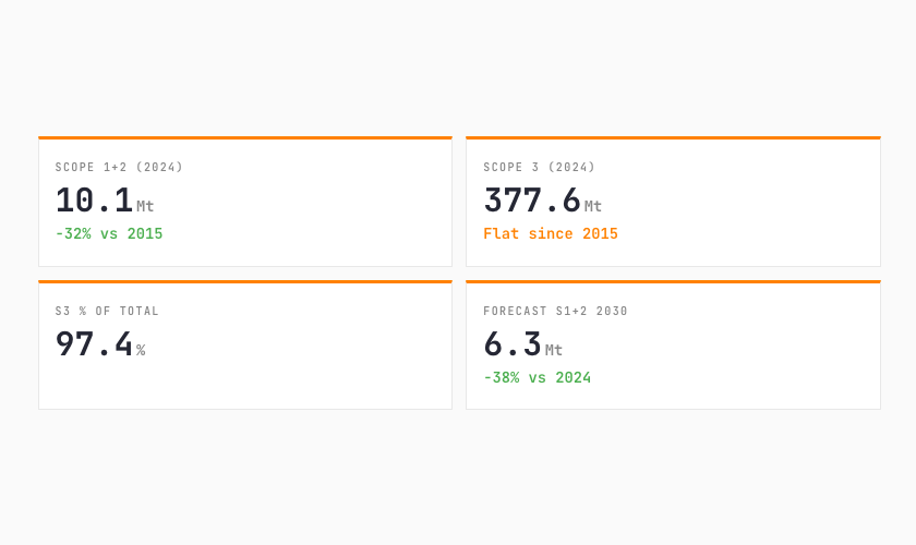 Scope 1+2 fell 32% since 2015 — a genuine decline. But Scope 3, where 97% of emissions sit, has flatlined at ~378 Mt for a decade. No formal targets returned.