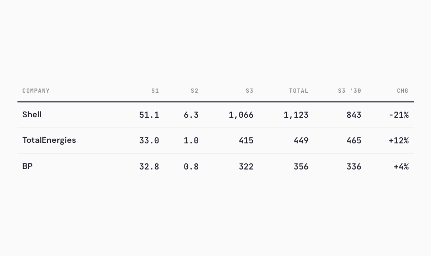 No. The forecast model projects TotalEnergies' Scope 3 increasing from 415 Mt to 465 Mt by 2030. It is the only one of the three oil majors with a rising trajectory.