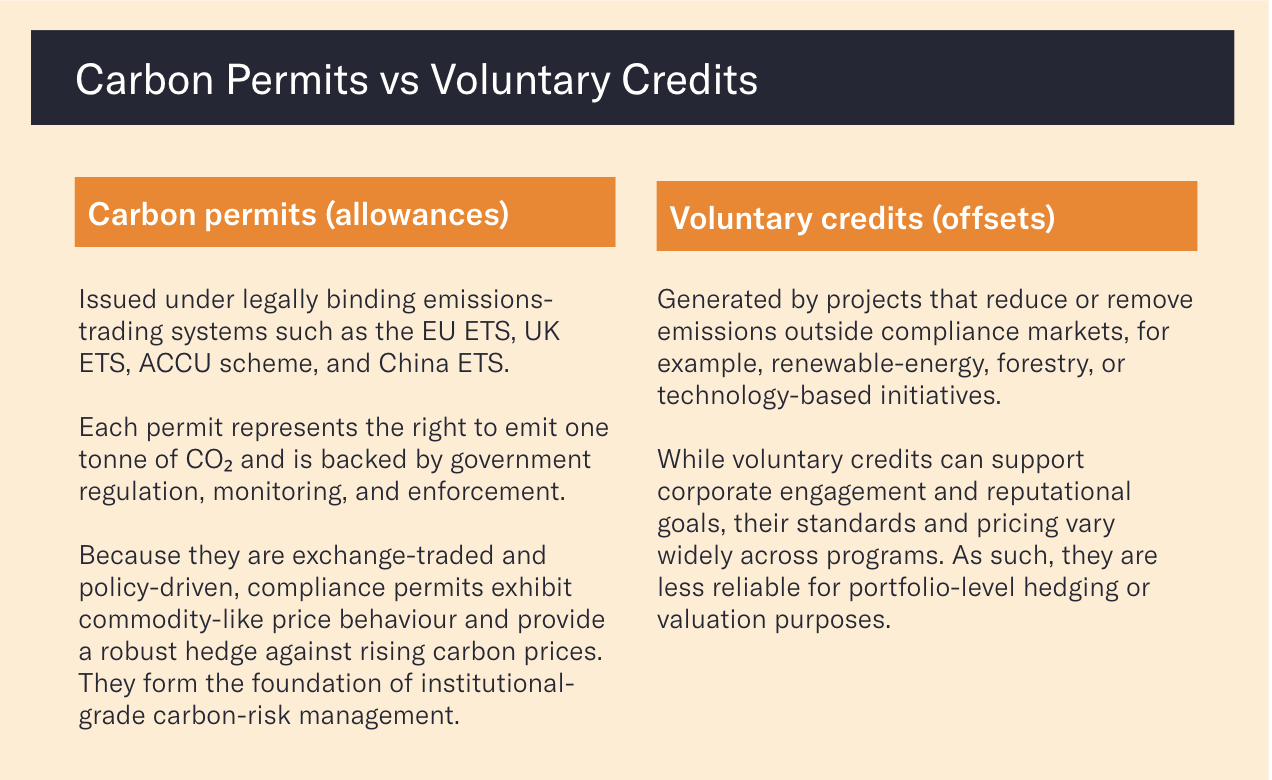 Traditional mitigation strategies, divestment [How to shrink climate risk not returns] or company engagement, remain essential but can be slow, incomplete, or constrained by investment mandates. Many investors face the dilemma of needing to hold carbon-intensive assets while wanting to reduce portfolio exposure. Carbon credits (referring to compliance-market permits or allowances used for hedging, not voluntary offsets), when used prudently, offer a financial instrument to bridge this gap.